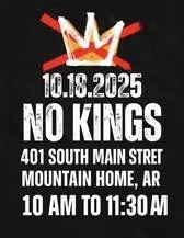 NO KINGS RALLY PLANNED FOR SATURDAY 10/18/25 from 10 to 11:30-Join us as at 401 South Main as we rally for no dictatorship in our country. We will have some signs, but if you have some bring those too. All are welcome.
